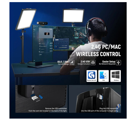 Upgraded to 3 Ways App Connections- Way 1.No Wifi Connect Needed-Plug the 2.4G USB dongle into your PC/Mac and download the "NEEWER Live 2.4G" App to enable remote control. Way 2.Wifi Connection - Requires to download the latest version (Windows V1.2.0 & macOS V1.4.0) of the "NEEWER Live" App on PC/Mac or pairing with the Elgato Stream Deck. Way 3.Bluetooth Connection- With the built-in Bluetooth module, you can also use your phone to control the lights via the " NEEWER " App.