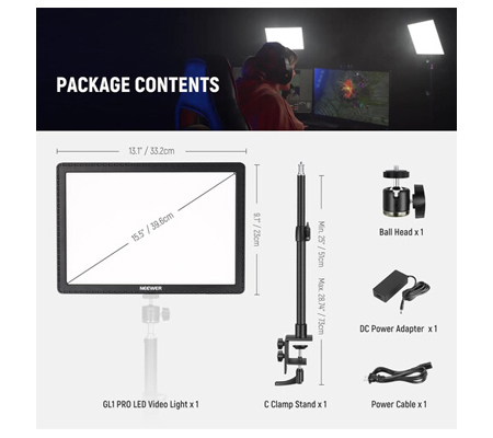 Silent Fanless Design & Desk Stand Included- TThe casing is made of material with excellent thermal conductivity to ensure good heat dissipation under the fanless, noiseless light operation. It brings immersive gaming experiences while not negatively affecting sound recording. Included desktop stand fits desks 0.4"-3" (0.9-7.5cm) thick and offers 13.8"-23.6" (35-60cm) height adjustment which allows you to use the GL1 as a key light or an overhead light