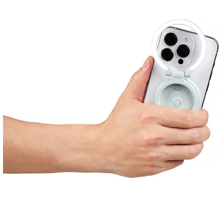 The lumo is MagSafe compatible, features a built-in battery, and boasts a foldable design that instantly converts it into a phone stand or grip. It creates a beautiful, soft ring glow and subtle catchlights in eyes. With lumo, you're always ready to shoot, shine, and share.