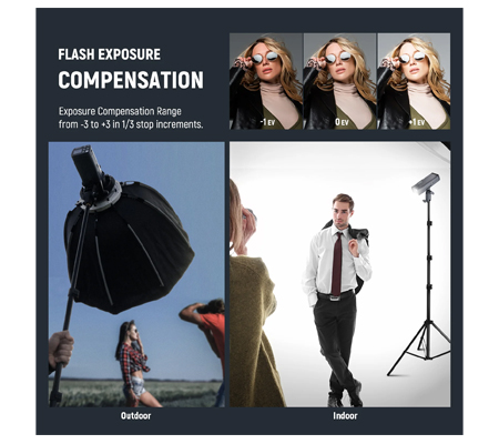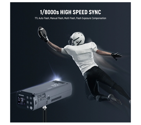 Optimized Performance- Powerful Flash with High GN58 (ISO100, @35mm), 200Ws of Power Adjustable in 8 Steps from 1/128 to 1/1, and Flash Duration as Short as 1/15380 sec, the 14.4V 3200mAh battery offers 500 full power flashes with 0.01-1.8 sec fast recycling.