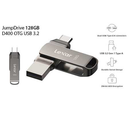 The Lexar® JumpDrive® Dual Drive D400 USB 3.2 Type-CTM is a 2-in-1 flash drive that allows you to seamlessly transfer content between your USB Type-CTM and Type-A devices. Featuring a stylish metal casing and swivel design for added protection, this drive is as tough as it is fast with transfer speeds up to 130MB/s1.