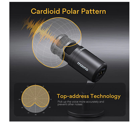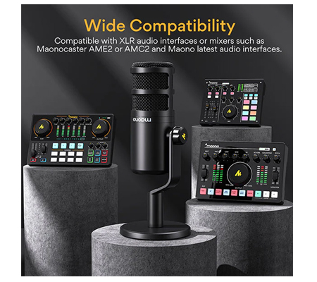 Maono PD100 is a dynamic microphone with a cardioid polar pattern to reduce background noise for a cleaner audio. There is a standard XLR output on the microphone for connecting audio interfaces or mixers. The full metal body delivers excellent shielding performance and durability. The PD100 microphone also includes all metal stand system to connect with a boom arm or place on desk. It is with professional-level performance and is suitable for streaming, gaming, podcasting, etc. It works great with Maonocaster AME2 or AMC2 and maono latest audio interface.