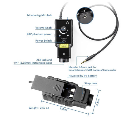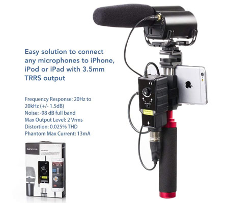 The SmartRig II XLR Mic & 1/4" Guitar Adapter with Phantom Power Preamp for Smartphonesfrom Saramonic is designed to connect any XLR microphone or a 1/4" guitar to your iPhone, iPod touch, iPad, or Android device. It can be used as a high-quality microphone preamp that allows you to capture audio using a professional stage microphone, or a high-end studio microphone for your smartphone device.