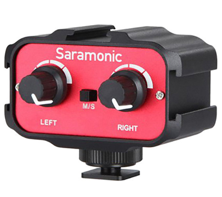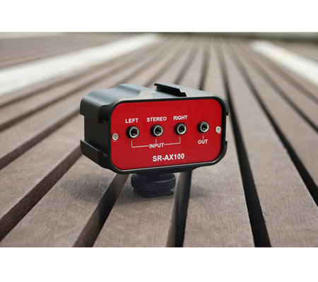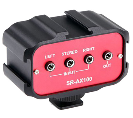 The SR-AX100 from Saramonic is a passive 2-channel audio adapter designed to provide a compact solution for recording two signals to any DSLR or camcorder that has a standard mounting shoe and a built-in audio jack. It features left and right trim controls, and requires no power source.
