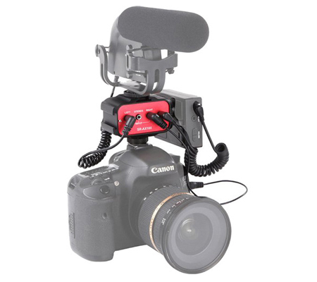 It has three integrated mounting shoes for attaching mics or wireless receivers. Connect inputs via two mono 3.5mm (1/8") jacks or the single stereo 3.5mm (1/8") jack. Route the stereo 3.5mm (1/8") output to your DSLR or camcorder. The output can be set to mono or stereo via the M/S switch.