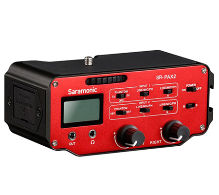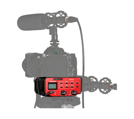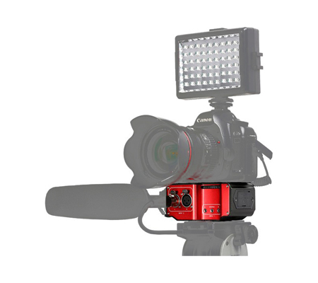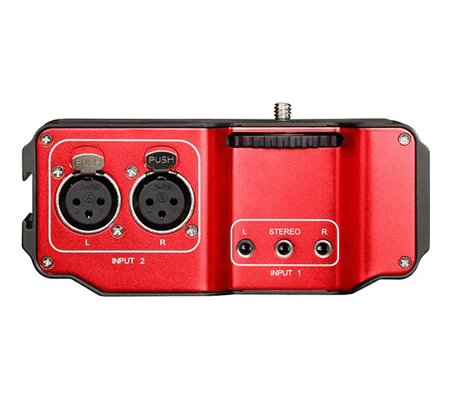 It attaches to the base of a camera, and can be mounted on a tripod or case. Connect inputs via two mono 3.5mm (1/8") jacks, the single stereo 3.5mm (1/8") jack, or two XLR jacks. Route the stereo 3.5mm (1/8") output to your DSLR or camcorder. The output can be set to mono or stereo via the M/S switch. A dedicated stereo 3.5mm (1.8") headphone output allows quick monitoring of the mic signals.