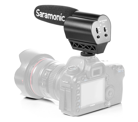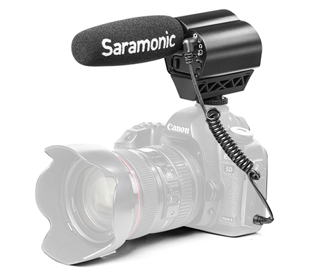 The Vmic Microphone from Saramonic is a broadcast-quality condenser microphone that provides professional audio for DSLR cameras and camcorders. The Vmic Mic allows you to adjust your level control (-10, 0, +20 dB), high-pass filter (150 Hz), and high-frequency boost (+6 dB), giving you the flexibility to capture audio in a wide range of environments. The detachable 3.5mm cable connects the mic to the audio input of the camera, while the stereo headphone output allows you to monitor the incoming audio. The shock mount system provides isolation from vibration and mechanical noise.