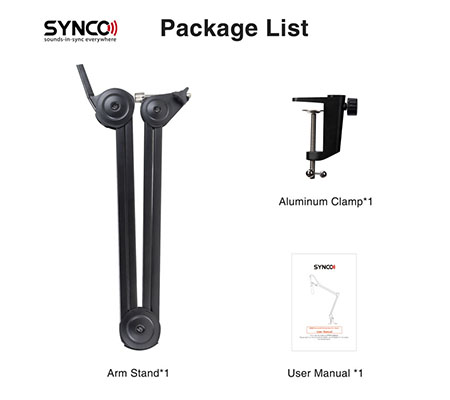 The top of stand is equipped with universal 5/8” threaded adapter, which applies to SYNCO, Blue Yeti, Snowball, Rode and most microphones of standard-size. Aluminum clamp can hold on to surface up to 5cm(1.96in) thick easily and tightly, in the mean time protecting the surface from getting scratches.
