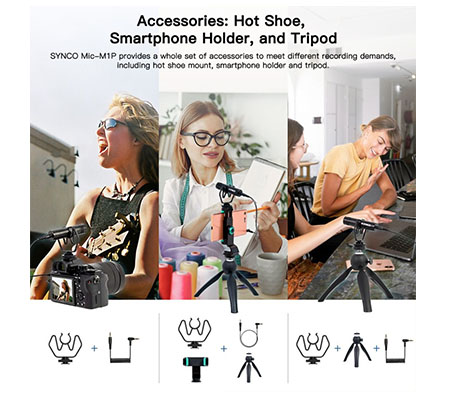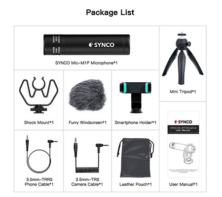 Compact and lightweight microphone.With the all-metal CNC aluminum alloy microphone tube, this compact microphone itself is only 3.19 inches long, portable for different scenes. And the whole set (microphone + shoe + tripod + phone clamp), only weighs 9.17oz, no problem to record for a long time with this extremely light little thing. | Universal compatibility.The SYNCO Mic-M1P microphone can work with DSLR cameras, camcorders, audio recorders, iPhone and Android smartphones, tablets and laptops, ideal for making microfilm, SLR recording, interviewing, live streaming, etc. | Accessories.SYNCO Mic-M1P provides a complete set of accessories to meet different recording demands, including hot shoe mount, smartphone mount with adjustable range from 2.2 '' to 3.5 '', 360 ° swivel ball head tripod, and TRS / TRRS cables 3.5mm, it will greatly facilitate video / audio recording. A spirit level fitted in the smartphone holder to calibrate the horizontal and vertical levels could also bring more convenience. |