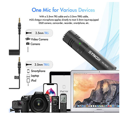 The 32g light and small device fits on the camera securely using a cold shoe or 1/4”screw hole, adding no weight to the small mobile device and never hindering your movement. The 3.5mm TRS/TRRS cables allow the camera shotgun mic to directly connect to most 3.5mm input DSLR cameras, recorders, smartphones, etc.