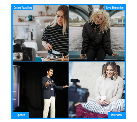 A 400mAh chargeable Li-ion battery is in-built to support 8-hour-long recording under ideal conditions. It supports charging-while-recording and can get 50% power in just 40 mins. Its status is seeable on the power indicator which flashes to tell low battery, stays green when charging, and is off when fully charged. The 3.5mm TRS audio output on the receiver is open to the included 3.5mm TRRS/TRS cables, making it applicable to almost all 3.5mm input cameras & camcorders, as well as Android/ iOS mobile devices. All these are held by this small wireless microphone, a camera- and collar-fixable device to stay out of the way when recording.
