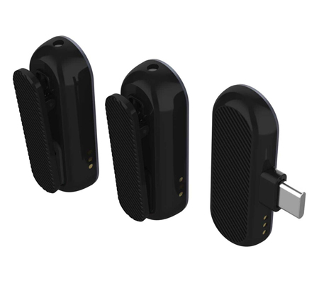 The dual microphone P2T and P2L are both equipped with a charging case - charging is available anytime and anywhere. Once the transmitter is in the case, there will be RED light on it to show that it is in charging. The united receiver is powered by the smartphone.