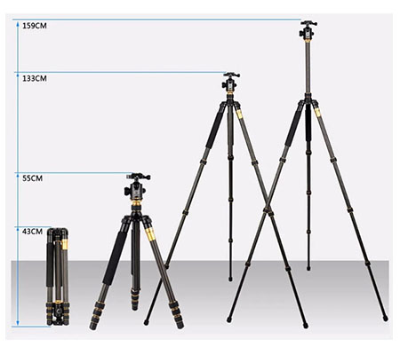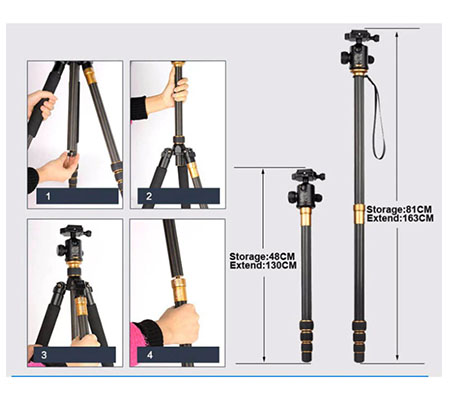 Features : - Made of premium carbon fiber for a lightweight travel tripod - Can be converted into a monopod - 4-section column legs with quick release locks, giving a more convenient handling experience at your desired height when shooting - Typical regulating design of elevator, offering the different damping effect depending on the weight of your camera. - The centre axis inverted function ensures you lowest shooting. - Supports disassembling into monopod use, flexible and changeable.