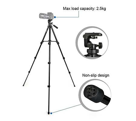 Benro T560 dilengkapi dengan kepala 3-way yang mendukung beban hingga 2.5kg cocok untuk aplikasi fotografi dan video.Kepala tripod menyediakan kontrol pan dan tilt. Quick release dengan sekrup standar 1/4 inch-20.