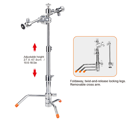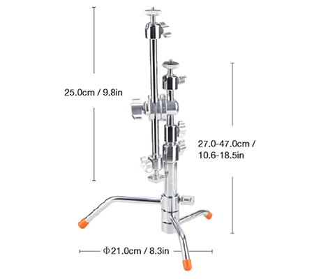 E-IMAGE LCS-MINI pocket C-Stand is ideal for tabletop or miniature photography.It's adjustable from a minimum height of 27cm to up to 47cm, making it easy to use in various tabletop and other miniature applications.It included a phone holder and three mini ball heads with 1/4-20”thread that can be mounted to camera,LED light,microphone and so on.