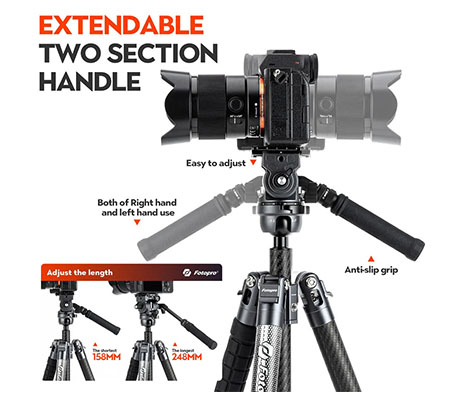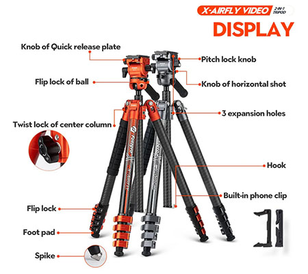 Fotopro X-Airfly Video photography carbon fiber travel tripod for camera only weighs 2.95lbs(1.34kg), but it can load up to 9.92lbs(4.5kg), the single tripod section load capacity 33.07lb(15kg). And the folding height 18.42 inches can be easily put into your bag when travelling.