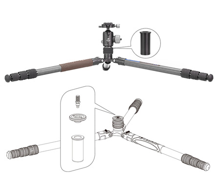 The multifunctional LX-284CT tripod is perfect for those who are looking for a complete tripod kit, which you can use in all directions. This tripod is great for travel, during a nice photo walk, at a state photography session, or in the studio. On the side of the tripod body is a threaded connection, where accessory arms can be attached. The bottom of the removable center column has a hook for some extra weight if you are looking for more stability. The included spikes screw easily under the tripod legs if you want to work on softer surfaces, such as in the dunes or snow.