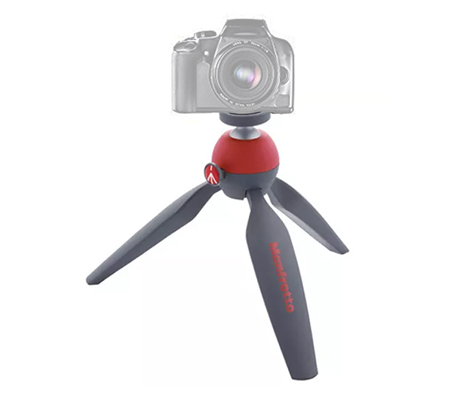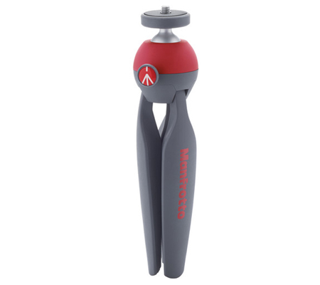 The red & gray PIXI Mini Table Top Tripod from Manfrotto doubles as a tabletop tripod and a handheld grip support for a DSLR, point and shoot, or compact camcorder. The legs are rounded on their outer side, so the closed tripod provides a comfortable hand grip. When open, the tripod and head have a maximum height of 5.31". Rubber feet prevent slipping and protect delicate surfaces.