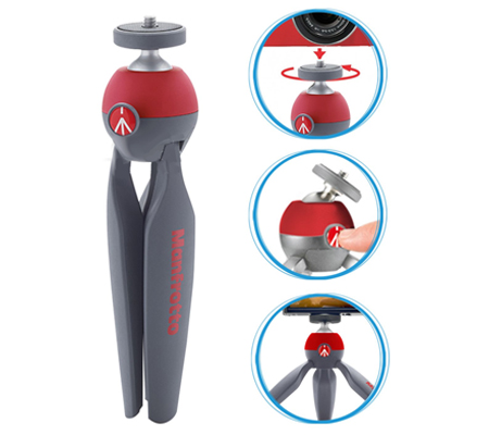 Fabricated from stainless steel and red & gray Adapto polymer, the PIXI supports up to 2.2 pounds while weighing only 6.7 ounces. Its built-in ball head has a 1/4"-20 camera screw and a unique design that allows adjustments and locking with a single push button. Besides cameras, the PIXI is also ideal for iPhones outfitted with the optional Manfrotto KLYP, and other small devices.