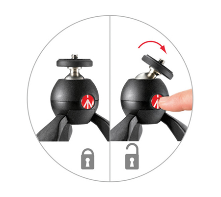 Fabricated from stainless steel and black Adapto polymer, the PIXI supports up to 2.2 pounds while weighing only 6.7 ounces. Its built-in ball head has a 1/4"-20 camera screw and a unique design that allows adjustments and locking with a single push button. Besides cameras, the PIXI is also ideal for iPhones outfitted with the optional Manfrotto KLYP, and other small devices.