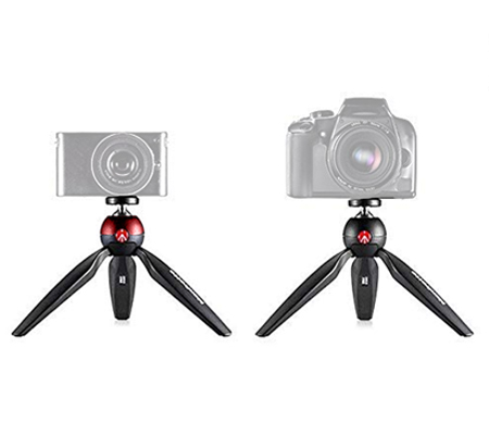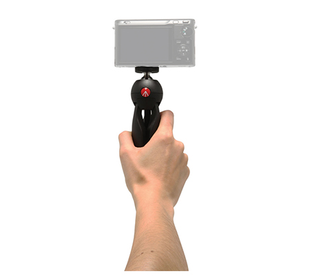 The black PIXI Mini Table Top Tripod from Manfrotto doubles as a tabletop tripod and a handheld grip support for a DSLR, point and shoot, or compact camcorder. The legs are rounded on their outer side, so the closed tripod provides a comfortable hand grip. When open, the tripod and head have a maximum height of 5.31". Rubber feet prevent slipping and protect delicate surfaces.