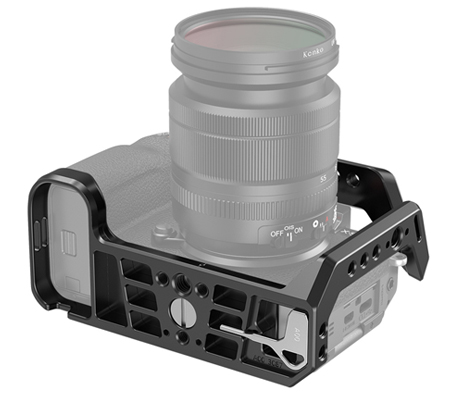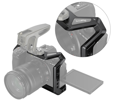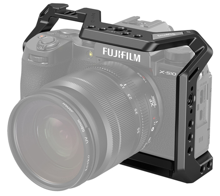 SmallRig Cage for FUJIFILM X-S10 Camera 3087 is a formfitting full cage designed to provide protection and accessory mounts. The cage secures to the camera via a 1/4"-20 screw on the bottom and a m2 screw on the right side for further security to prevent twisting. Featuring multiple 1/4"-20 and ARRI 3/8"-16 accessory threads for accessories, such as Side Handle HSN2093, Cold Shoe 2260, Monitor Mount 2903, and Top Handle 2165. The cage integrates with a cold shoe on the top for microphone and light?and comes with a NATO Rail on the left side allows for mounting the Side Handle 2187. The bottom comes with 1/4"-20 and 3/8"-16 threads to attach a camera plate, such as Manfrotto Plate 1280 and APU2458. A flat head screwdriver with an Allen wrench is included to secure the camera screw and stores on the bottom of the cage. The bottom integrates an Arca Swiss plate enables mounting on a tripod head. The cage maintains access to all buttons, LCD screen and dummy battery cable. Optional HDMI Cable Clamp 1679 is separately available to protect the HDMI port.