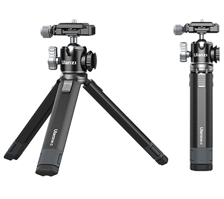 The MT-24 Two-Stage Camera Vlog Tripod with Ball Head from Ulanzi is a compact and versatile tabletop tripod suitable for use with cameras, smartphones, and other devices weighing up to 5.5 lb. It features an Arca-type ball head with a screw knob for quick adjustment and easy operation and a rotating cold shoe to attach a microphone, compact LED light, or other accessory. The extendable, two-position legs may be closed to form a grip handle with a maximum height of 8.3" for handheld stability when weblogging. The compact form factory and versatility are well suited for tabletop use, videoconferencing, and creating online video content.
