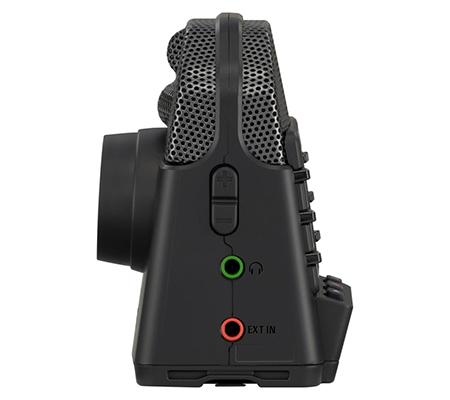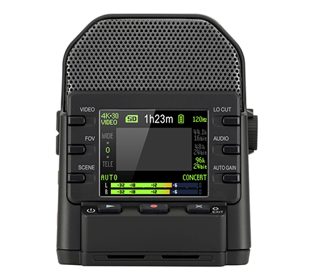 The Q2n-4K's stereo condenser mics are arranged in an X/Y pattern and can handle sound pressure levels up to 120 dB, standing up to even loud rock stages. An audio-only mode records standalone WAV files up to 24-bit/96 kHz. Audio functions include auto gain, a low-cut filter, a 3.5mm line-in/mic-in port, and a headphone output.