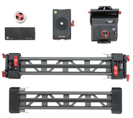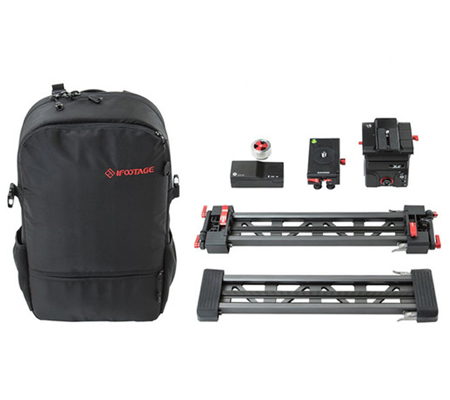 The Shark Slider Mini Complete from iFootage includes two tracks, a slider carriage, two track stand accessories, a flywheel, an X2 Mini pan and tilt head, a slide module, two batteries, cables, and a soft backpack. This 3-axis automated motion-control system is small and light enough to carry in your rucksack, yet big enough to provide you with smooth movement. The modular design and seamless track extension lets you connect the tracks, for a travel distance up to 24".