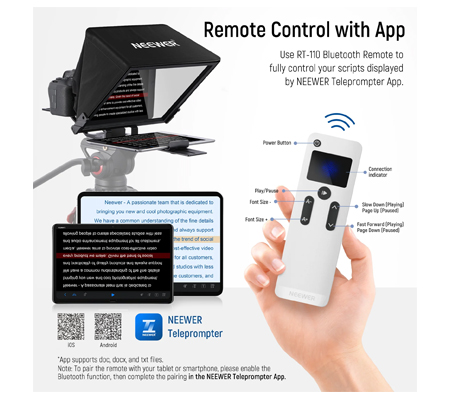 • Download NEEWER Teleprompter App from major app stores for free, and manage all your scripts effortlessly. You can import, compose, edit, and customize your scripts, and use RT-110 remote to manipulate them remotely even when recording the video all by yourself. Compatible with iOS 11.0/Android 6.0 or later. Note: The NEEWER Teleprompter app only supports uploading txt and doc, docx format files.