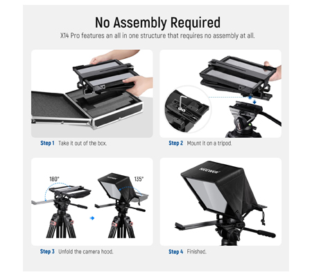 • The beam splitter glass features two sides: a transparent side for the camera to shoot videos and a reflective side that displays the script for you. The hinged frame can tilt at 135° for desired viewing angles.