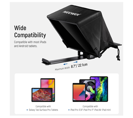• NEEWER X14 Pro Teleprompter enables you to read your script verbatim and look directly into the camera when recording a video. Since there is no need to recite the script, you can be more relaxed and have natural communication with your audience. It is compatible with tablets that have a display size up to 14". Compatible with iPad 12.9" iPad Pro 11" iPad Pro iPad mini, and all types of smartphones on the market.