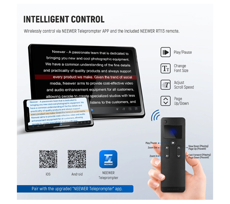 • Smart APP Remote ControlPair the RT113 remote (included) with your phone inside our NEEWER Teleprompter App via Bluetooth connection, then you can pause, speed up and down, and turn pages of scripts with a few clicks. The remote has a discreet black appearance and quiet buttons for unaffected shooting. The app is compatible with iOS 11.0/Android 6.0 and later and available in major app stores for free download