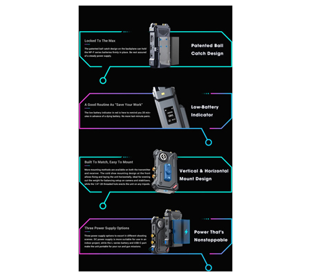 The system operates on the 5 GHz frequency band and is encrypted to prevent video leakage. The system supports smart channel selection, allowing the system to choose the cleanest channel for transmission. It also supports UVC pull streaming. Both units also feature a bright, easy-to-read OLED display. Each unit is designed to be powered via an L-series battery plate, by the included D adapter, or with an optional USB power supply via the USB Type-C port. Four standard antennas and two mushroom antennas are supplied for the receiver and transmitter.