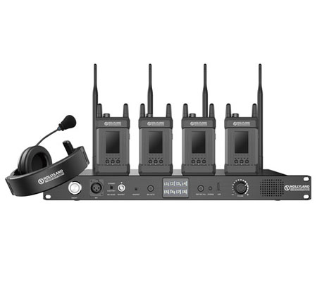 Ideal for broadcasting, training, and meetings, the Hollyland Syscom 1000T-4B is a full-duplex intercom system offering carrier-grade voice quality and wireless tally at a range of up to 1000 feet. It includes a base station with four high-gain antennas, four beltpack transceivers with chargers, four headsets, and a gooseneck microphone.